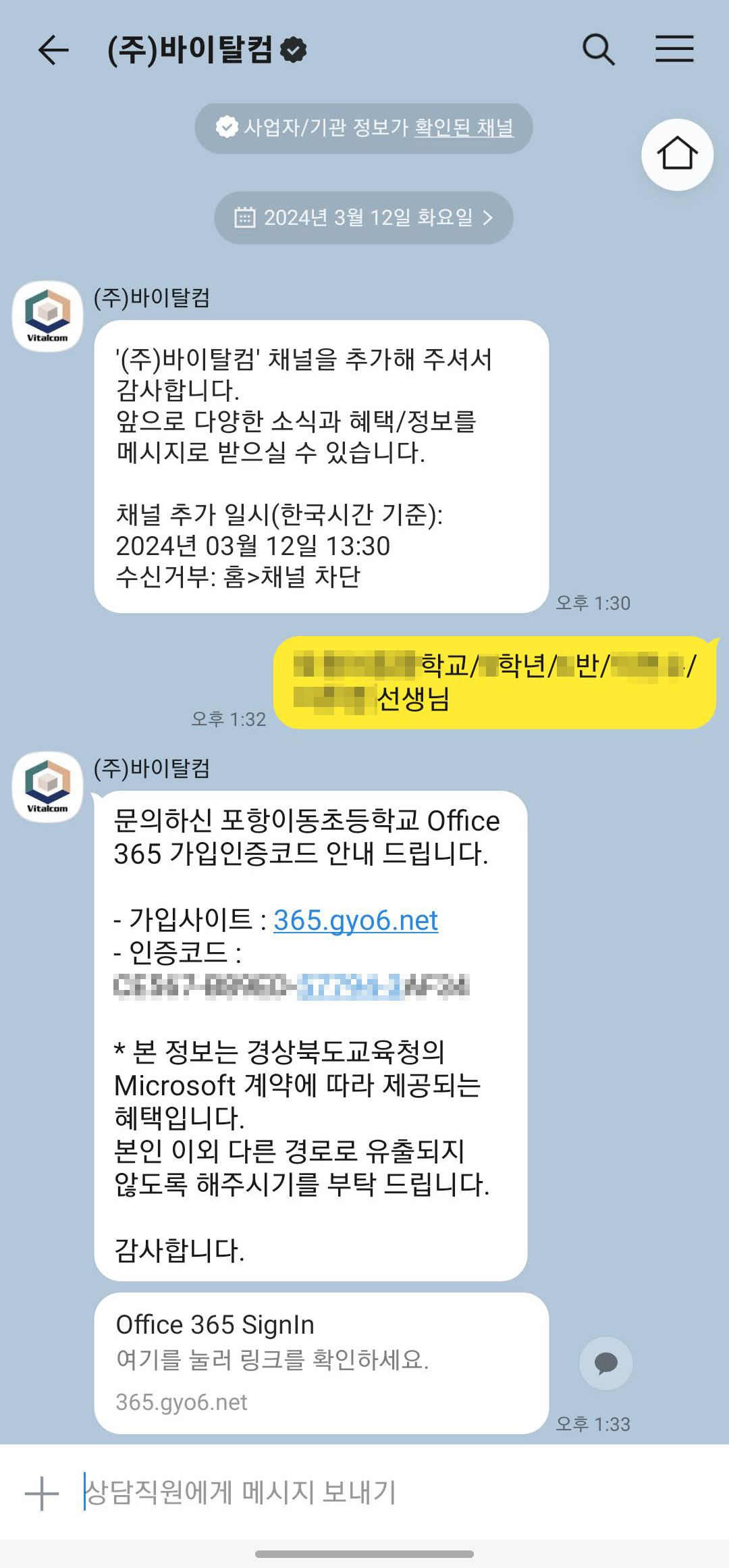 교육청마다 다르겠지만 경북교육청 소속 초, 중, 고 학생들의 경우, 카카오톡에서 "바이탈컴"을 검색하여 상담사에게 [학교명/학년/반/이름/담임선생님이름]을 보내면 확인 후 즉시 코드를 발급해 줍니다.